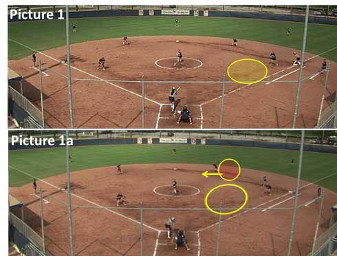 The defense is expecting a bunt which is why they are playing in. But, because 1st base is playing in the 2nd baseman must cover 1st, and the Shortstop must cover 2nd. So what we see in Picture 2a, is the batter push bunting the ball to the SS and forcing her (the SS) to field the ball, which means can’t also cover 2nd base. The Red circle around 2nd base shows the base is wide open since the 2nd baseman had to cover 1st (since the 1st baseman was playing in), and the SS couldn’t cover 2nd base because she’s fielding the ball. |